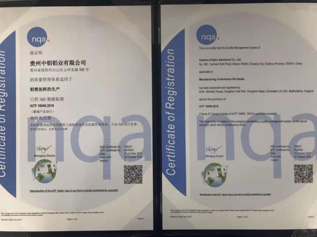 為了向高端電池箔坯料市場及超薄鋁箔坯料轉型,助推企業高質量發展,2021 年以來,在公司黨支部書記、董事長朱玉才、總經理蔡海濤的共同謀劃下,通過各部門協調配合,貴州中鋁于10月27日獲得IATF16949認證證書。